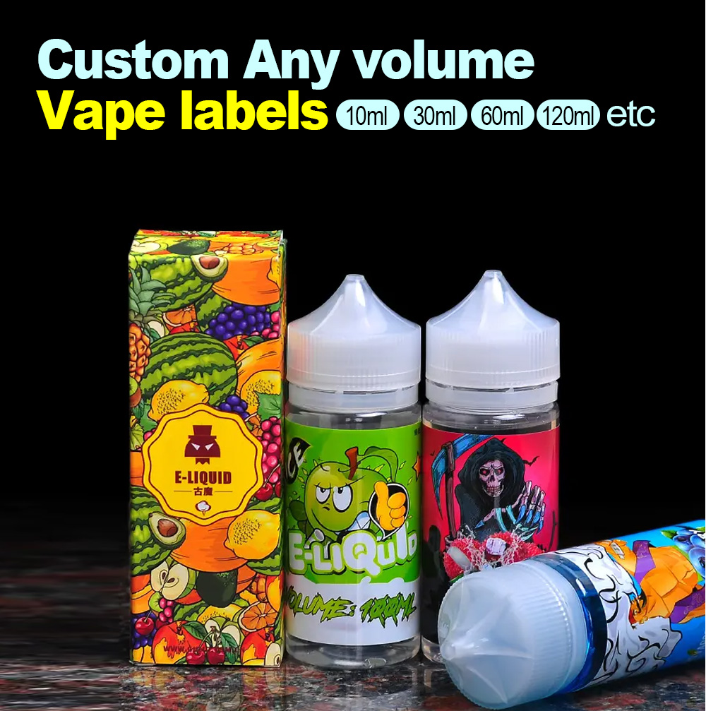 Unique Design e-liquid and vape labels stickers customized for any size shapes and materials, all of volume bottle size ejuice labels custom printing.