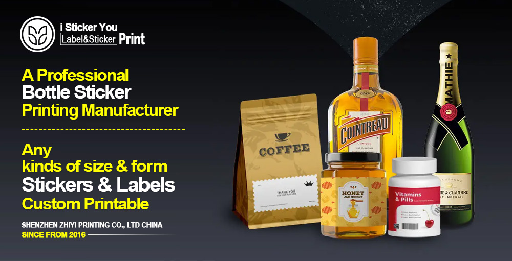 Custom Bottle label stickers printed and die-cut free design and samples for any kinds of bottle size shapes